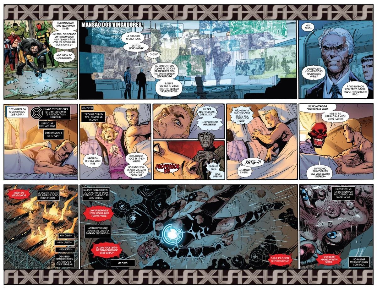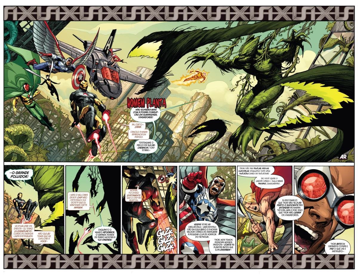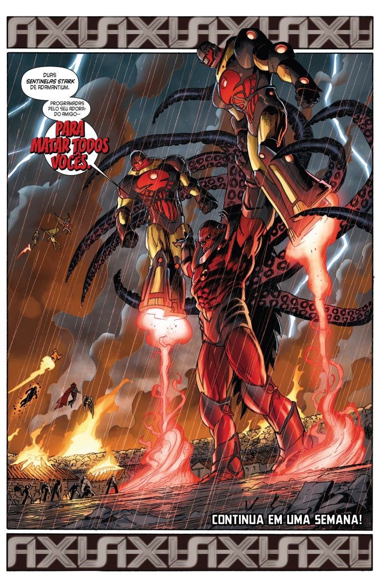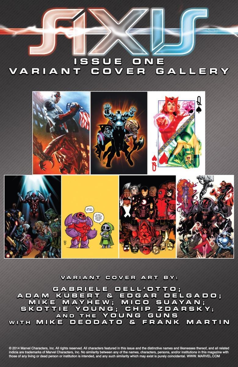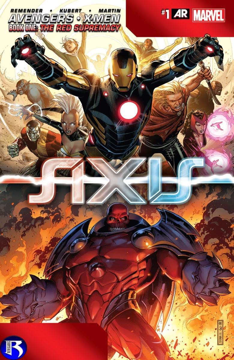 Depois de uma guerra entre Vingadores e X-Men, a moralidade de muitos heróis é invertida devido a Red Onslaught. Heróis como Capitão América e Homem de Ferro se tornam vilões, enquanto vilões como Magneto e Loki começam a agir como heróis. "Eixo" redefine as identidades e papéis desses personagens, afetando o futuro da equipe.